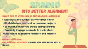With spring activities around the corner, whether that’s getting outside for more walks or starting yard work, now is the perfect time to make sure your spine and nervous system are functioning well. When your body is properly aligned, you’ll notice better flexibility, balance, and overall comfort as you move through your day.